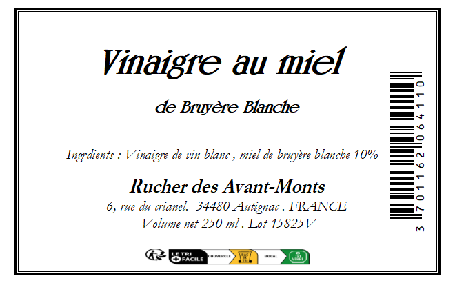 Issu d’une collaboration avec un grand spécialiste local du vinaigre haut de gamme, nous avons élargi notre gamme de produit à base de miel. Nous vous proposons ce vinaigre très subtil et raffiné, élaboré avec notre miel de Bruyère blanche, récolté autour de notre village.